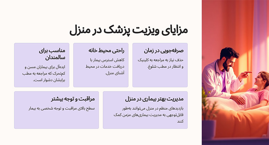- راحتی حضور بیمار در محیط شخصی: درمان در خانه میتواند سطح اضطراب و استرس بیمار را کاهش دهد. محیط آشنای خانه میتواند به بیماران کمک کند تا در طول مدت ویزیت خود، احساس آرامش بیشتری داشته باشند. همچنین این ویزیت بهطور بالقوه منجر به ارتباط بهتر و تشخیص دقیقتر پزشک میشود؛